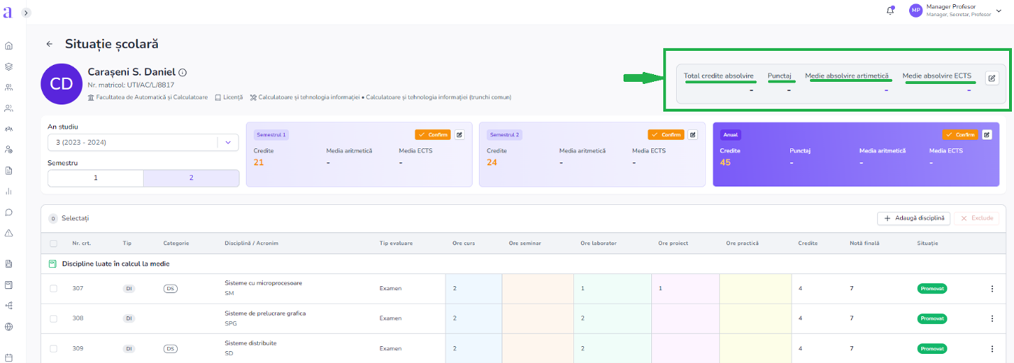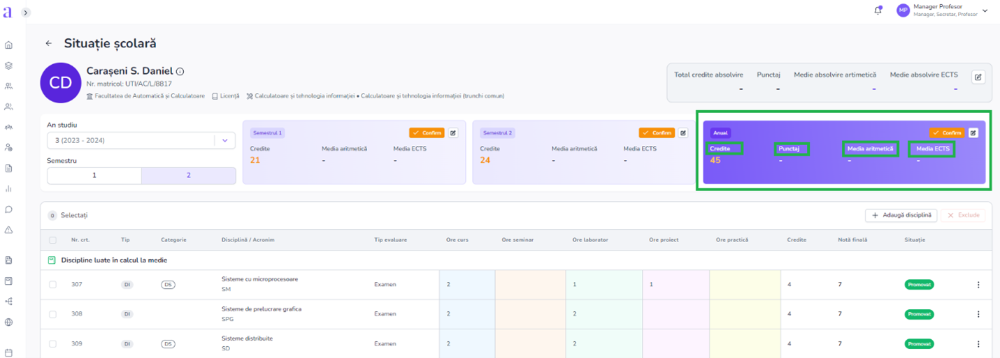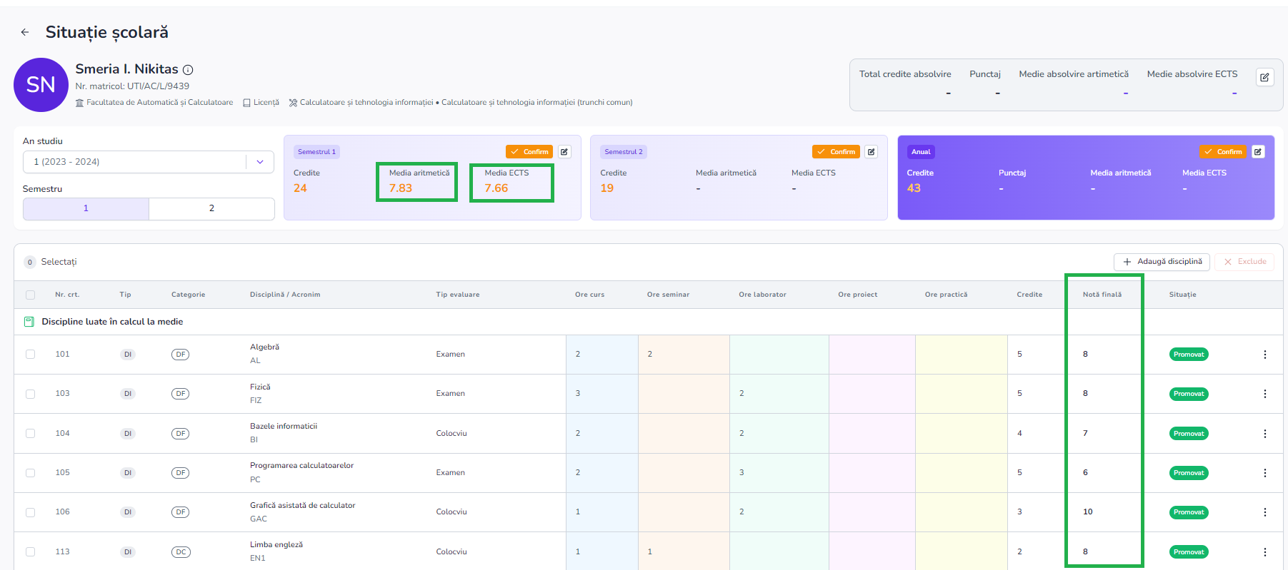 - In cardul de pe semestrul 1 si 2 gasim informatii precum numarul de credite, media aritmetica si media ponderata (ECTS)