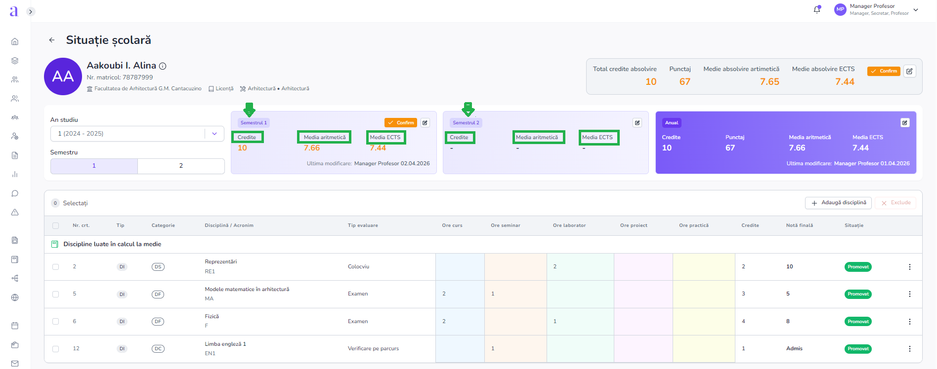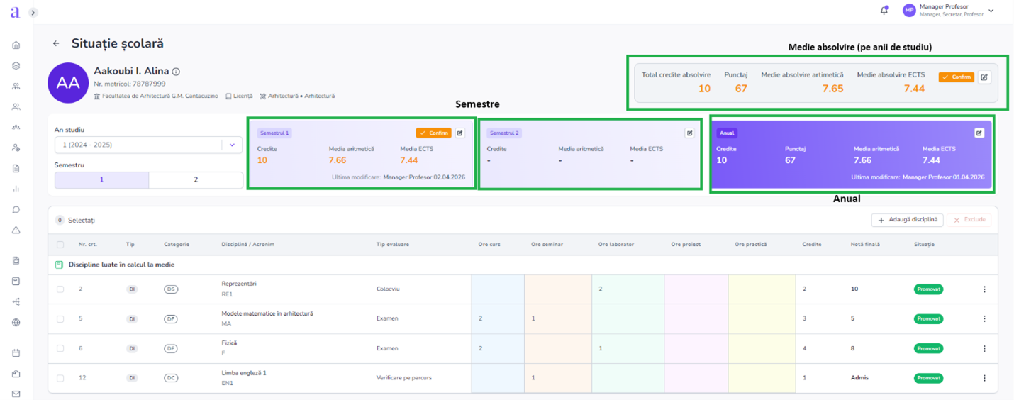 - În secțiunea «Catalog – Situație școlară» este afișat calculul mediei academice aritmetice și ponderate ECTS.