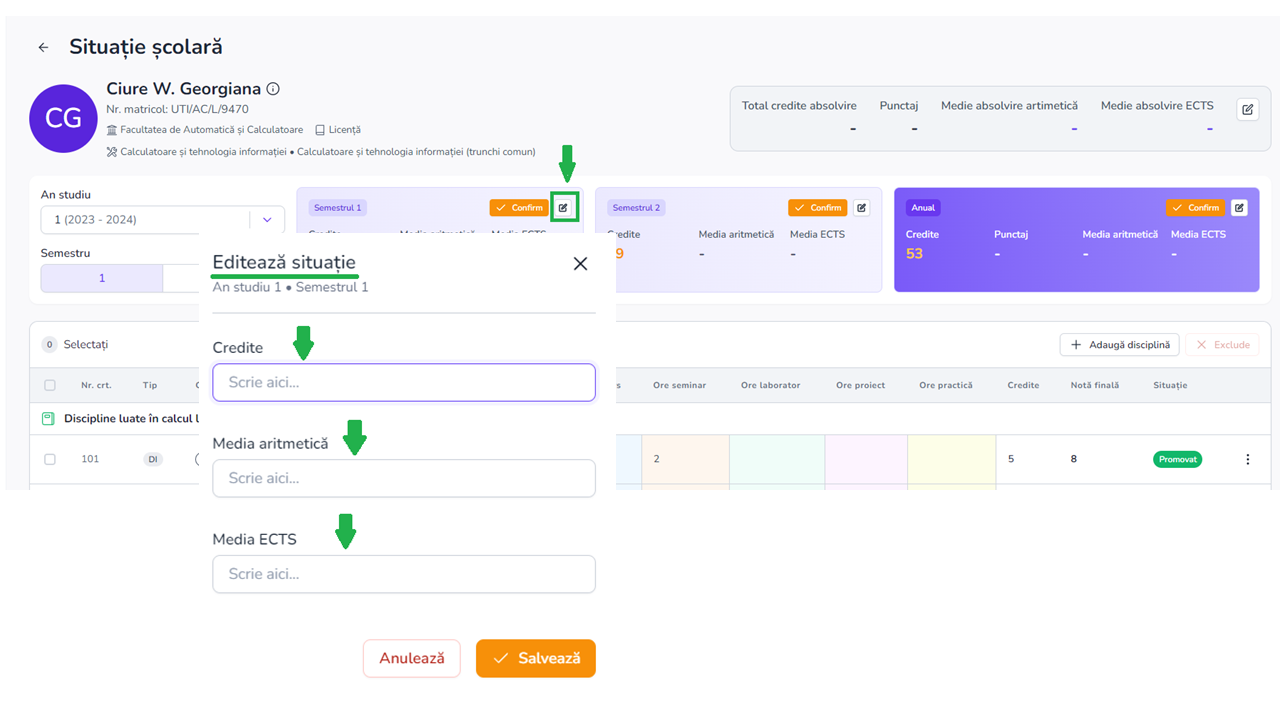 - Secțiunea utilizează două tipuri de medii: media aritmetică și media ponderată (bazată pe creditele ECTS) cu două opțiuni de gestionare: