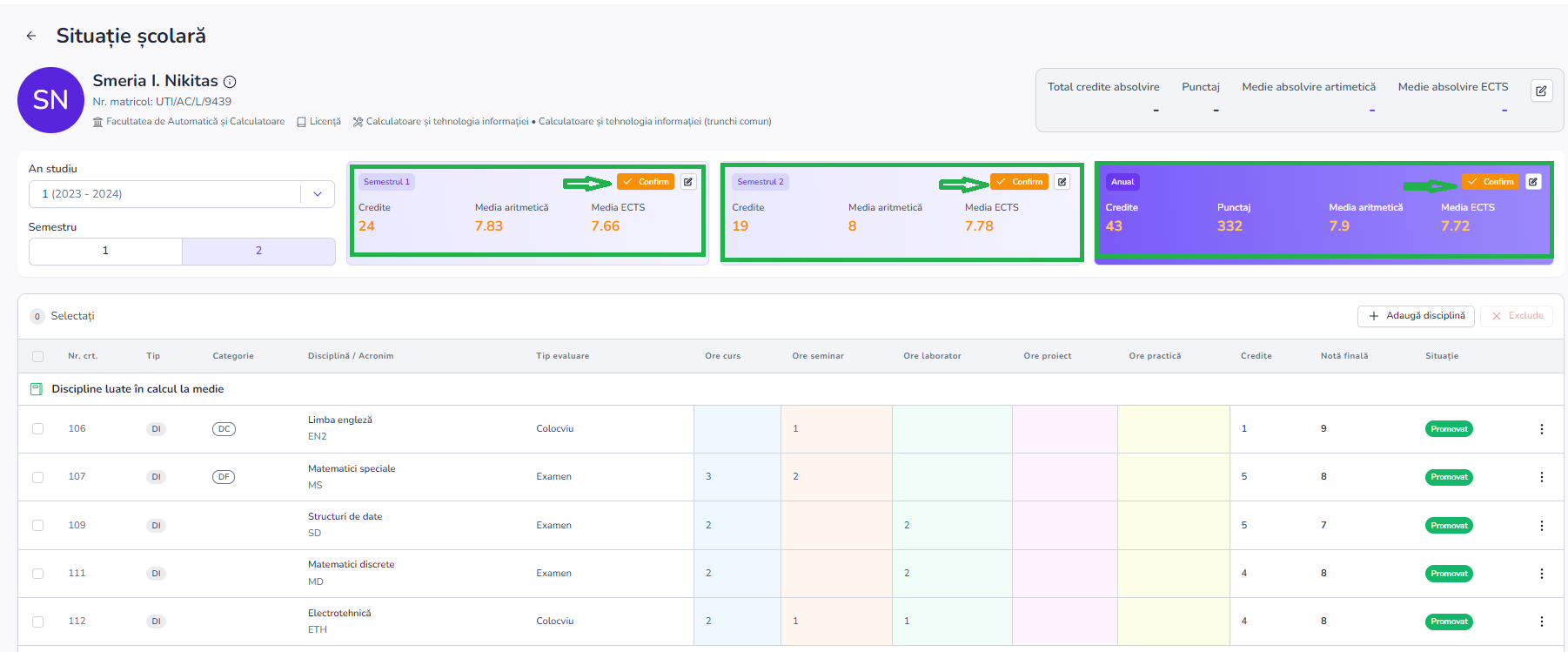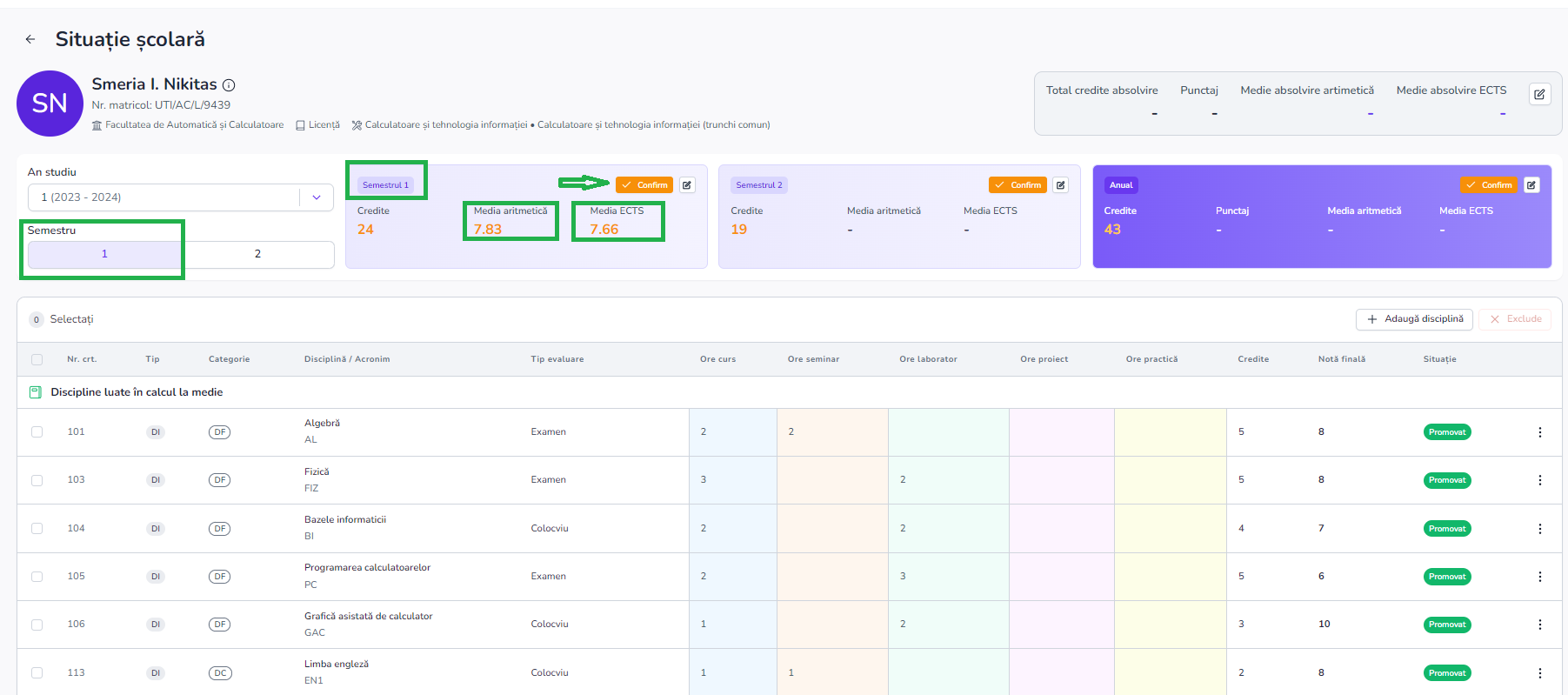• Media anuală poate fi confirmată numai după confirmarea mediilor pentru ambele semestre.