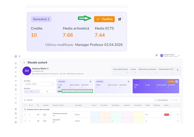 • Secretarul are posibilitatea de a modifica și confirma media generată automat.