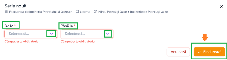 - Pentru definirea intervalului de școlarizare, completează câmpurile“de la “ si “pana la” din meniul dropdown indicat apoi butonul “Finalizeaza”.