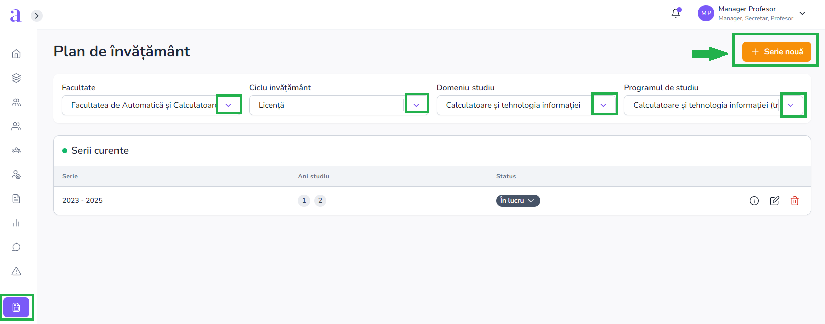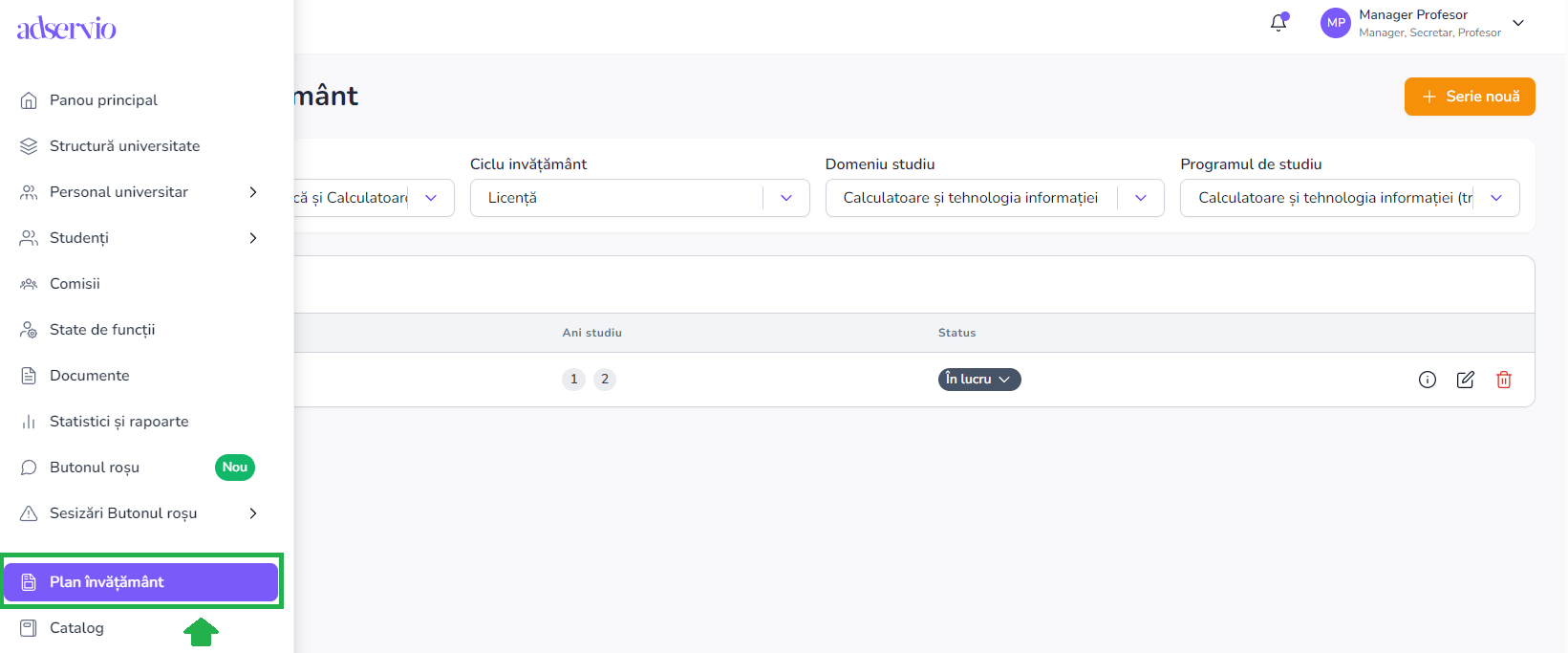 - După finalizare, seria va putea fi ulterior editată, completată cu discipline și gestionată în cadrul celorlalte funcționalități ale modulului de plan de învățământ.