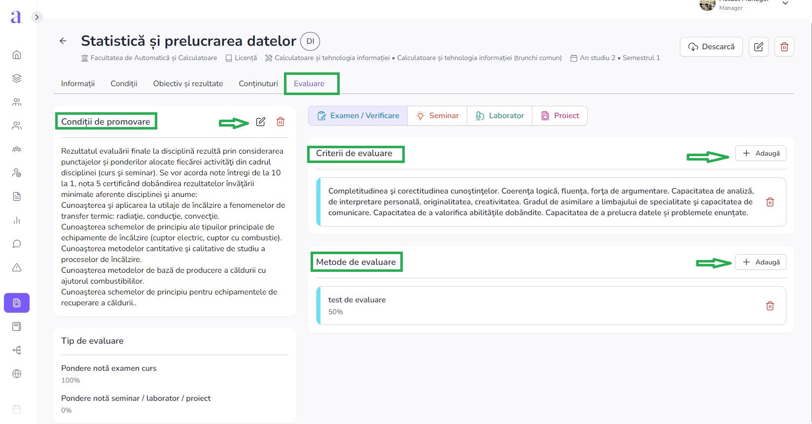 - În secțiunea „Evaluare”, se va adăuga „Condiții de promovare” (de tip text), precum și „Criterii de evaluare” și „Metode de evaluare”, utilizând butonul „+ Adaugă”.