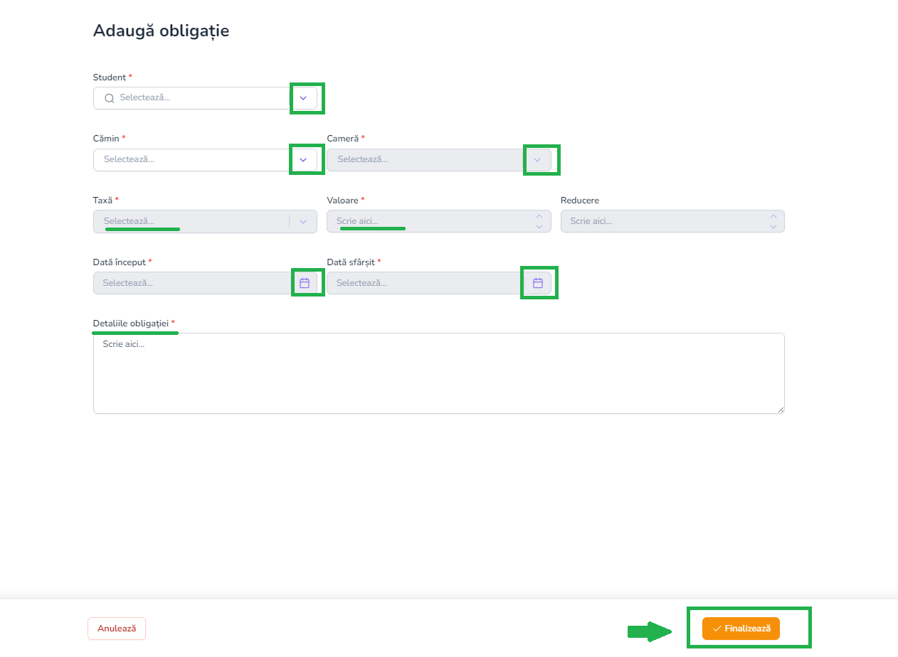 - Ecranul „Adaugă obligație” îți permite să creezi o nouă obligație de plată pentru un student cazat într-un anumit cămin și într-o anumită cameră. Formularul este structurat astfel încât să completezi întâi datele de identificare (student, cămin, cameră), iar apoi detaliile financiare ale obligației.