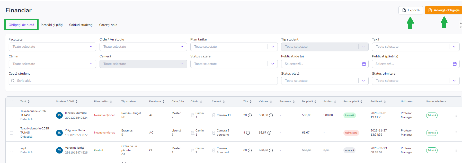 - Vei gasi obligatia creata in zona centrală a paginii in tabelul cu obligații de plată, fiecare rând reprezentând o taxă de cazare asociată unui student.