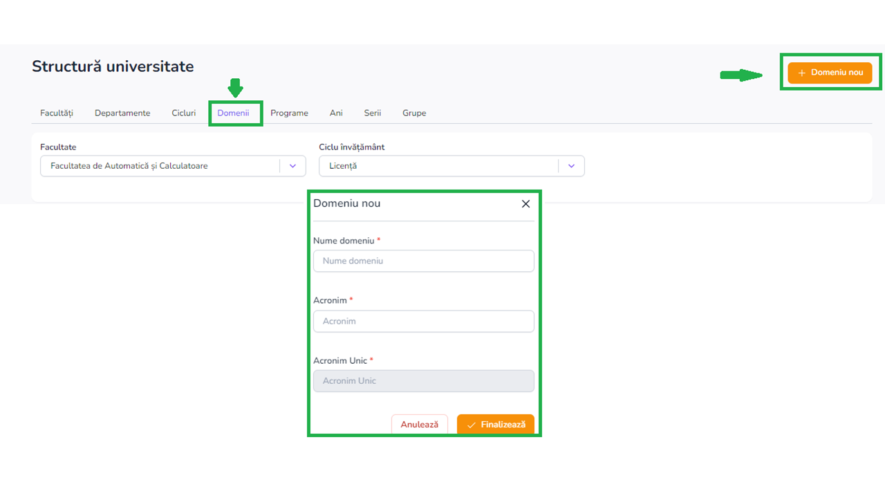- Pas următor constă în adăugarea domeniului de studiu corespunzător pentru a asigura asocierea corectă a facultății cu domeniul academic aferent. Apasă butonul “Domeniu nou”, completeaza campurile “Nume domeniu” si “Acronimul” iar “Acronimul unic” se completeaza automat. Apasa butonul “Finalizeaza”.