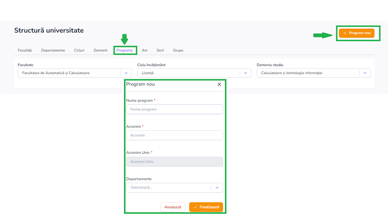 - În continuare, se creează programele de studiu, prin adăugarea acestora în cadrul domeniilor definite anterior. Apasă butonul “Program nou”, completeaza campurile “Nume program” si “Acronimul” iar “Acronimul unic” se completeaza automat. Nu este obligatoriu sa se completeze departamentul. Apasa butonul “Finalizeaza”.