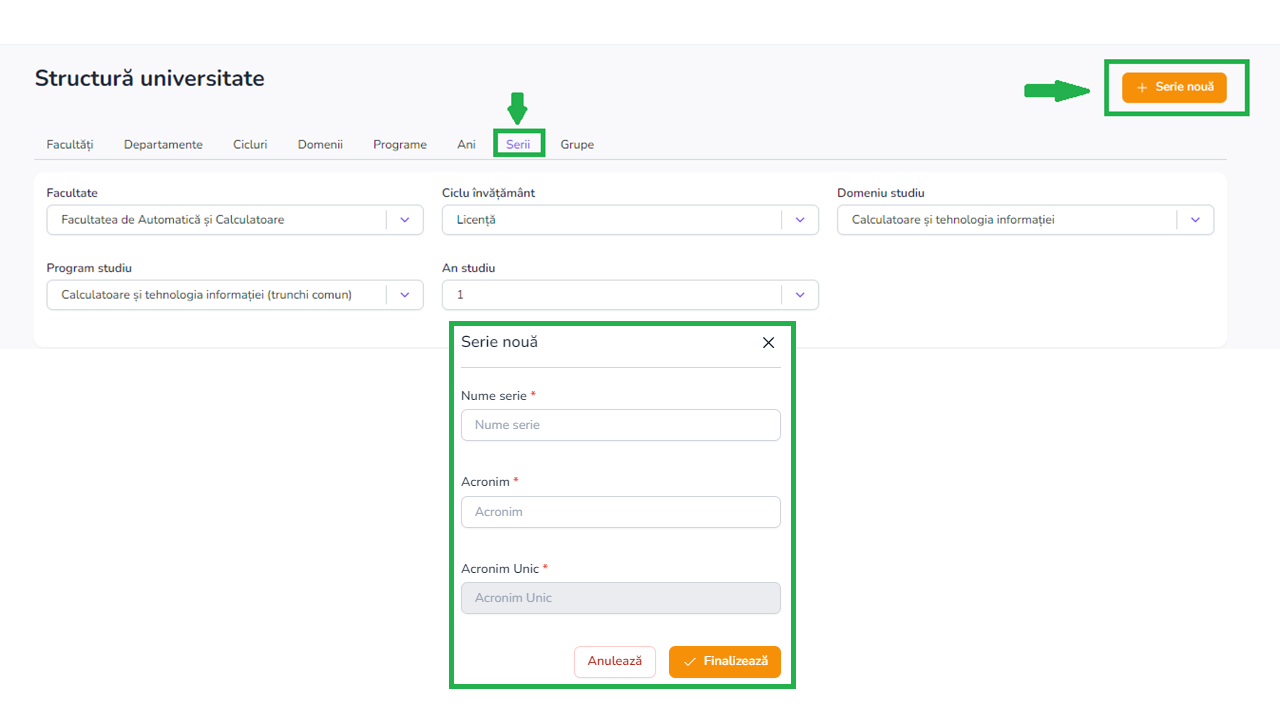 - În continuare, anii de studiu pot fi împărțiți în serii, atunci când există un număr mare de studenți, pentru o gestionare mai eficientă. Apasă butonul “Serie noua”, completeaza campurile “Nume serie” si “Acronimul” iar “Acronimul unic” se completeaza automat. Seriile pot fi denumite folosind cifre (1, 2) sau litere (A, B), în funcție de preferințele instituției. Apasa butonul “Finalizeaza”.