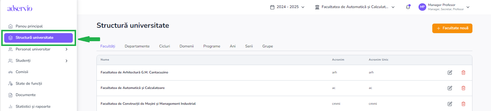 - Pentru a accesa modulul, din meniul principal selecteaza „Structură universitate”.