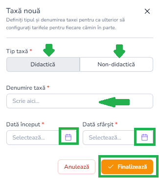 • Pentru a salva taxa nouă, apasă „Finalizează”.