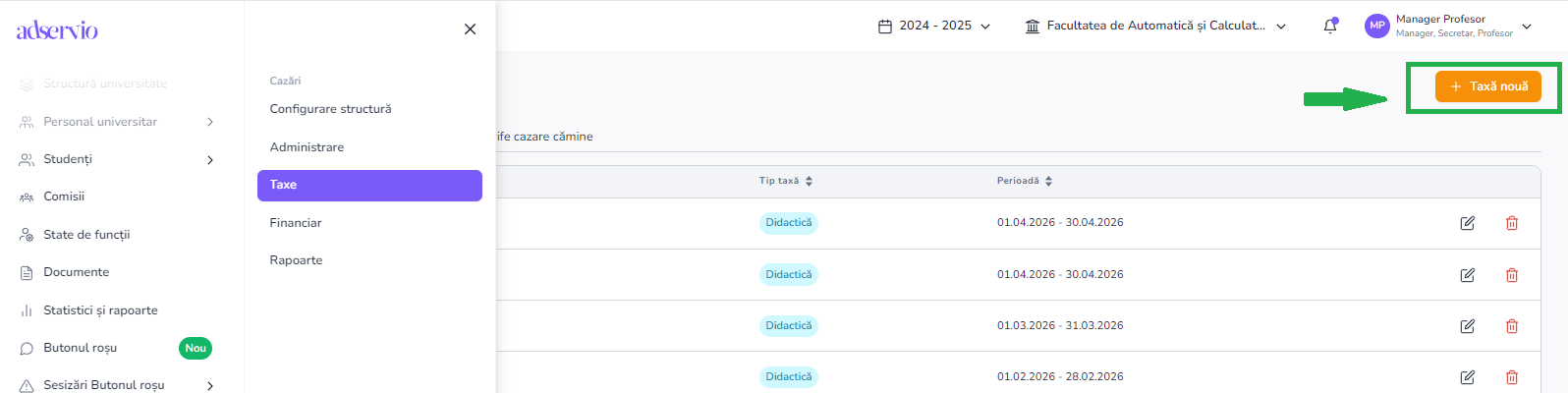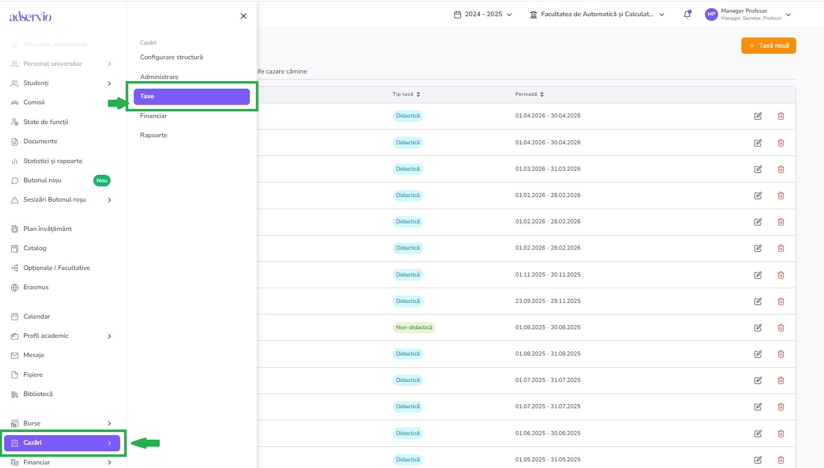 • Taxele de cazare se gestioneaza din meniul de Cazări , submeniul „Taxe”, unde sunt afișate toate taxele de cazare configurate pentru cămine.
