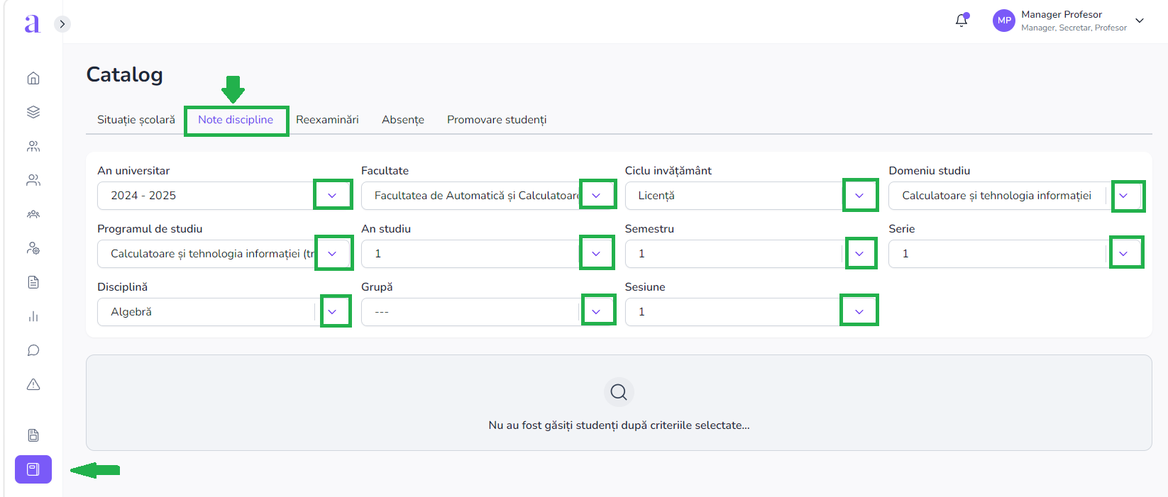 • Accesați modulul ‘Catalog‘ din bara de navigare din stanga. Apoi selectați opțiunea ‘Note discipline‘ din partea de sus, iar în filtrele disponibile, selectați: anul universitar, facultatea, ciclul de învățământ, domeniul de studiu, programul de studiu, anul de studiu, seria, disciplina, grupa si sesiunea pentru care doriți să descărcați catalogul.