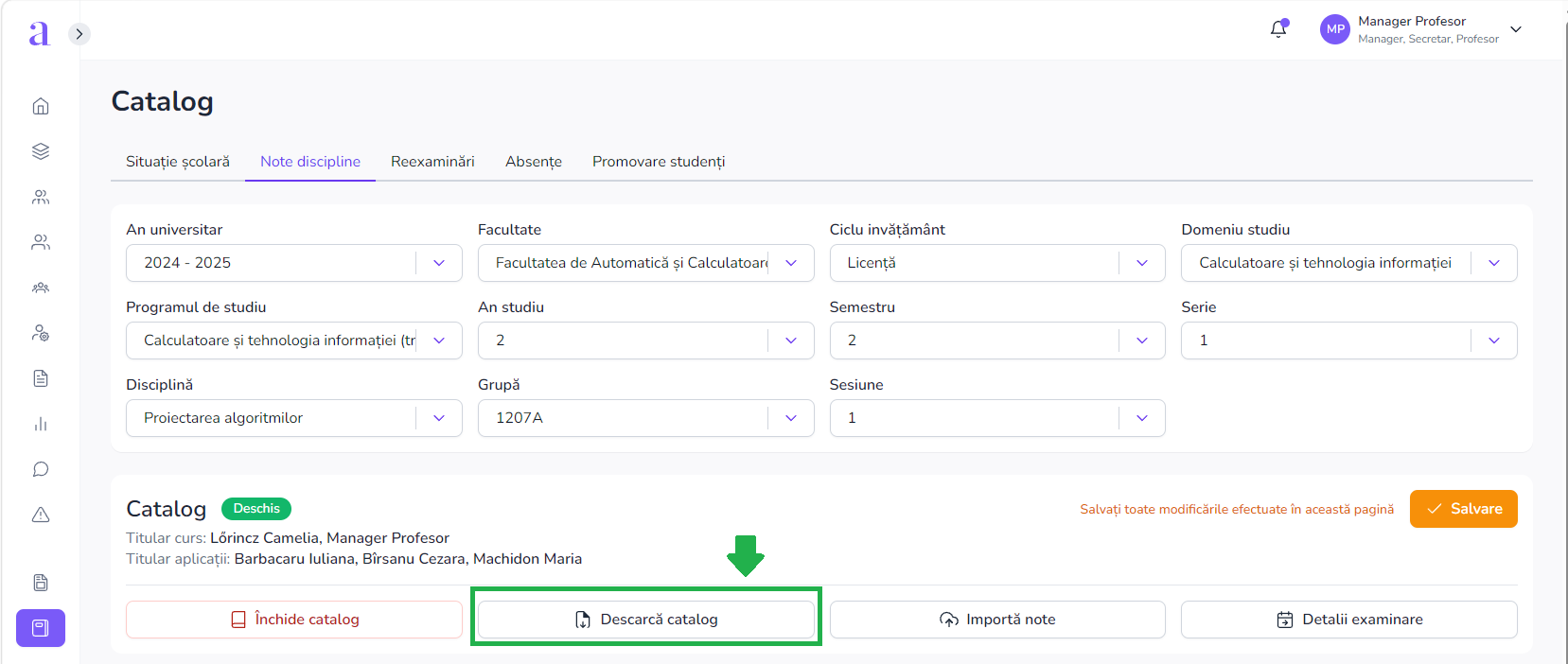 Pentru a descărca ‘Catalogul‘ din rolul de secretar, urmați acești pași: