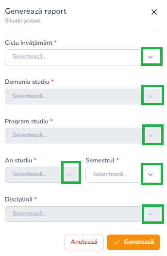 - În zona principală vei vedea titlul „Generează raport – Situații școlare”, completeaza formularul cu următoarele câmpuri: “Ciclu învățământ” , „Domeniu studiu”, „Program studiu”, „An studiu”, „Semestrul”, „Disciplină.