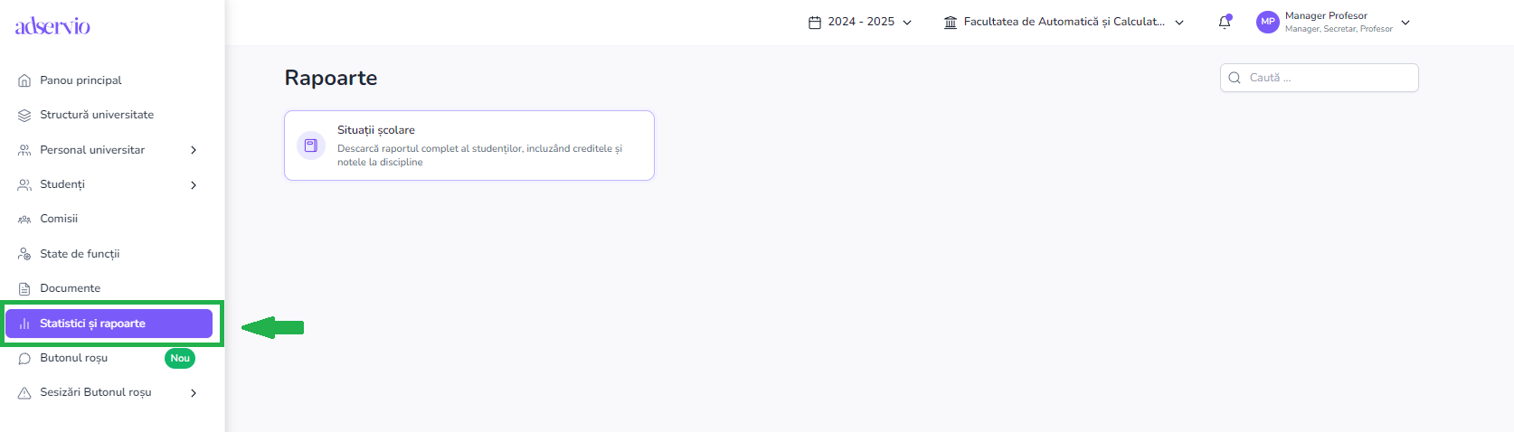 - Din meniul principal, acceseaza modulul „Statistici și rapoarte”.