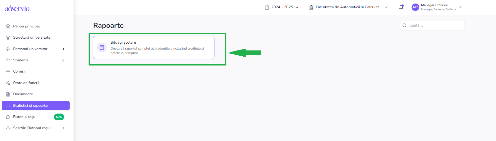 - După accesare, vei vedea pagina de Rapoarte -> “Situatii scolare”