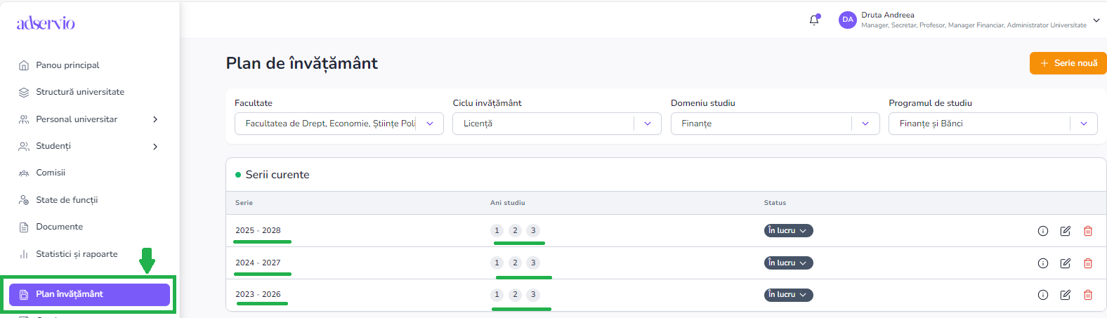 Pentru a putea modifica ponderea unei dicipline in calcularea notei finale se alege din meniul principal ‘Plan de Invatamant’, apoi se selecteaza seria in care se gaseste anul universitar, apoi ‘activitati didactice‘, anul , semestrul pe care este alocata disciplina;